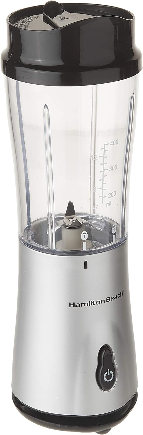 The Hamilton Beach Single Serve Blender with Travel Lid allows you to make smoothies, shakes, dressings, small-batch salsas and more to your desired consistency and taste with simply the press of a button. The stainless steel blades can easily cut through ice and frozen fruit, delivering smooth, consistent results every time.